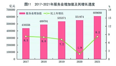 全年批發(fā)和零售業(yè)增加值110493億元,比上年增長(zhǎng)11.3%;交通運(yùn)輸、倉儲(chǔ)和郵政業(yè)增加值47061億元,增長(zhǎng)12.1%;住宿和餐飲業(yè)增加值17853億元,增長(zhǎng)14.5%;金融業(yè)增加值91206億元,增長(zhǎng)4.8%;房地產(chǎn)業(yè)增加值77561億元,增長(zhǎng)5.2%;信息傳輸、軟件和信息技術(shù)服務(wù)業(yè)增加值43956億元,增長(zhǎng)17.2%;租賃和商務(wù)服務(wù)業(yè)增加值35350億元,增長(zhǎng)6.2%。全年規(guī)模以上服務(wù)業(yè)企業(yè)營業(yè)收入比上年增長(zhǎng)18.7%,利潤(rùn)總額增長(zhǎng)13.4%。(見圖11)