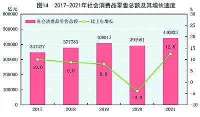 全年社會(huì)消費(fèi)品零售總額440823億元,比上年增長(zhǎng)12.5%。按經(jīng)營地統(tǒng)計(jì),城鎮(zhèn)消費(fèi)品零售額381558億元,增長(zhǎng)12.5%;鄉(xiāng)村消費(fèi)品零售額59265億元,增長(zhǎng)12.1%。按消費(fèi)類型統(tǒng)計(jì),商品零售額393928億元,增長(zhǎng)11.8%;餐飲收入額46895億元,增長(zhǎng)18.6%。(見圖14)