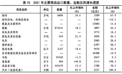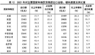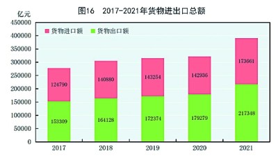 全年貨物進(jìn)出口總額391009億元,比上年增長(zhǎng)21.4%。其中,出口217348億元,增長(zhǎng)21.2%;進(jìn)口173661億元,增長(zhǎng)21.5%。貨物進(jìn)出口順差43687億元,比上年增加7344億元。對(duì)“一帶一路”[44]沿線國家進(jìn)出口總額115979億元,比上年增長(zhǎng)23.6%。其中,出口65924億元,增長(zhǎng)21.5%;進(jìn)口50055億元,增長(zhǎng)26.4%。(見圖16)(見表9)(見表10)(見表11)(見表12)