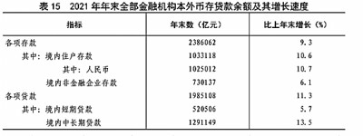 全年社會(huì)融資規(guī)模增量[45]31.4萬億元,按可比口徑計(jì)算,比上年少3.4萬億元。年末社會(huì)融資規(guī)模存量[46]314.1萬億元,按可比口徑計(jì)算,比上年末增長(zhǎng)10.3%,其中對(duì)實(shí)體經(jīng)濟(jì)發(fā)放的人民幣貸款余額191.5萬億元,增長(zhǎng)11.6%。年末全部金融機(jī)構(gòu)本外幣各項(xiàng)存款余額238.6萬億元,比年初增加20.2萬億元,其中人民幣各項(xiàng)存款余額232.3萬億元,增加19.7萬億元。全部金融機(jī)構(gòu)本外幣各項(xiàng)貸款余額198.5萬億元,增加20.1萬億元,其中人民幣各項(xiàng)貸款余額192.7萬億元,增加19.9萬億元。人民幣普惠金融貸款[47]余額26.5萬億元,增加5.0萬億元。(見表15)