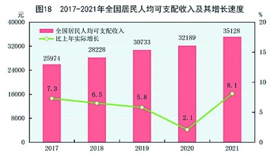 全年全國居民人均可支配收入35128元,比上年增長(zhǎng)9.1%,扣除價(jià)格因素,實(shí)際增長(zhǎng)8.1%。全國居民人均可支配收入中位數(shù)[53]29975元,增長(zhǎng)8.8%。按常住地分,城鎮(zhèn)居民人均可支配收入47412元,比上年增長(zhǎng)8.2%,扣除價(jià)格因素,實(shí)際增長(zhǎng)7.1%。城鎮(zhèn)居民人均可支配收入中位數(shù)43504元,增長(zhǎng)7.7%。農(nóng)村居民人均可支配收入18931元,比上年增長(zhǎng)10.5%,扣除價(jià)格因素,實(shí)際增長(zhǎng)9.7%。農(nóng)村居民人均可支配收入中位數(shù)16902元,增長(zhǎng)11.2%。城鄉(xiāng)居民人均可支配收入比值為2.50,比上年縮小0.06。按全國居民五等份收入分組[54],低收入組人均可支配收入8333元,中間偏下收入組人均可支配收入18445元,中間收入組人均可支配收入29053元,中間偏上收入組人均可支配收入44949元,高收入組人均可支配收入85836元。全國農(nóng)民工人均月收入4432元,比上年增長(zhǎng)8.8%。全年脫貧縣[55]農(nóng)村居民人均可支配收入14051元,比上年增長(zhǎng)11.6%,扣除價(jià)格因素,實(shí)際增長(zhǎng)10.8%。