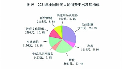 全年全國居民人均消費(fèi)支出24100元,比上年增長(zhǎng)13.6%,扣除價(jià)格因素,實(shí)際增長(zhǎng)12.6%。其中,人均服務(wù)性消費(fèi)支出[56]10645元,比上年增長(zhǎng)17.8%,占居民人均消費(fèi)支出的比重為44.2%。按常住地分,城鎮(zhèn)居民人均消費(fèi)支出30307元,增長(zhǎng)12.2%,扣除價(jià)格因素,實(shí)際增長(zhǎng)11.1%;農(nóng)村居民人均消費(fèi)支出15916元,增長(zhǎng)16.1%,扣除價(jià)格因素,實(shí)際增長(zhǎng)15.3%。全國居民恩格爾系數(shù)為29.8%,其中城鎮(zhèn)為28.6%,農(nóng)村為32.7%。(見圖18)(見圖19)