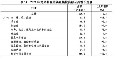 全年對(duì)外非金融類直接投資額7332億元,比上年下降3.5%,折1136億美元,增長(zhǎng)3.2%。其中,對(duì)“一帶一路”沿線國家非金融類直接投資額203億美元,增長(zhǎng)14.1%。(見表14)