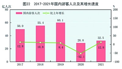 全年國內(nèi)游客32.5億人次,比上年增長(zhǎng)12.8%。其中,城鎮(zhèn)居民游客23.4億人次,增長(zhǎng)13.4%;農(nóng)村居民游客9.0億人次,增長(zhǎng)11.1%。國內(nèi)旅游收入29191億元,增長(zhǎng)31.0%。其中,城鎮(zhèn)居民游客花費(fèi)23644億元,增長(zhǎng)31.6%;農(nóng)村居民游客花費(fèi)5547億元,增長(zhǎng)28.4%。(見圖22)
