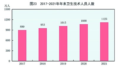 年末全國共有醫(yī)療衛(wèi)生機(jī)構(gòu)103.1萬個(gè),其中醫(yī)院3.7萬個(gè),在醫(yī)院中有公立醫(yī)院1.2萬個(gè),民營醫(yī)院2.5萬個(gè);基層醫(yī)療衛(wèi)生機(jī)構(gòu)97.7萬個(gè),其中鄉(xiāng)鎮(zhèn)衛(wèi)生院3.5萬個(gè),社區(qū)衛(wèi)生服務(wù)中心(站)3.6萬個(gè),門診部(所)30.7萬個(gè),村衛(wèi)生室59.9萬個(gè);專業(yè)公共衛(wèi)生機(jī)構(gòu)1.3萬個(gè),其中疾病預(yù)防控制中心3380個(gè),衛(wèi)生監(jiān)督所(中心)2790個(gè)。年末衛(wèi)生技術(shù)人員1123萬人,其中執(zhí)業(yè)醫(yī)師和執(zhí)業(yè)助理醫(yī)師427萬人,注冊(cè)護(hù)士502萬人。醫(yī)療衛(wèi)生機(jī)構(gòu)床位957萬張,其中醫(yī)院748萬張,鄉(xiāng)鎮(zhèn)衛(wèi)生院144萬張。全年總診療人次[70]85.3億人次,出院人數(shù)[71]2.4億人。截至年末,全國累計(jì)報(bào)告新型冠狀病毒肺炎確診病例102314例,累計(jì)治愈出院病例94792例,累計(jì)死亡4636人。全國累計(jì)報(bào)告接種新型冠狀病毒疫苗283533萬劑次。全國共有11937家醫(yī)療衛(wèi)生機(jī)構(gòu)提供新型冠狀病毒核酸檢測(cè)服務(wù),總檢測(cè)能力達(dá)到4168萬份/天。(見圖23)