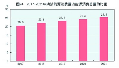初步核算,全年能源消費(fèi)總量52.4億噸標(biāo)準(zhǔn)煤,比上年增長(zhǎng)5.2%。煤炭消費(fèi)量增長(zhǎng)4.6%,原油消費(fèi)量增長(zhǎng)4.1%,天然氣消費(fèi)量增長(zhǎng)12.5%,電力消費(fèi)量增長(zhǎng)10.3%。煤炭消費(fèi)量占能源消費(fèi)總量的56.0%,比上年下降0.9個(gè)百分點(diǎn);天然氣、水電、核電、風(fēng)電、太陽能發(fā)電等清潔能源消費(fèi)量占能源消費(fèi)總量的25.5%,上升1.2個(gè)百分點(diǎn)。重點(diǎn)耗能工業(yè)企業(yè)單位電石綜合能耗下降5.3%,單位合成氨綜合能耗與上年持平,噸鋼綜合能耗下降0.4%,單位電解鋁綜合能耗下降2.1%,每千瓦時(shí)火力發(fā)電標(biāo)準(zhǔn)煤耗下降0.5%。全國萬元國內(nèi)生產(chǎn)總值二氧化碳排放[78]下降3.8%。(見圖24)
