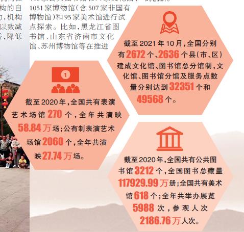 文化和旅游部公共服務司負責人介紹,從規(guī)???,截至2021年10月,全國約有94%的縣(市、區(qū))建成了文化館的總分館制,分館數量3.2萬個,93%的縣(市、區(qū))建成圖書館的總分館制,分館數量4.9萬個;從效果看,總分館制改革促進了公共文化服務供給側與需求側的有效對接,并且通過因地制宜在商業(yè)中心、社區(qū)學校、機場車站等人流密集處設立特色分館,開展“嵌入式”“數字化”服務,有效降低了運營成本,實現(xiàn)了設施和服務“房前屋后遍地開花”。