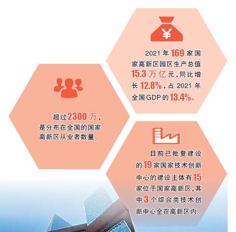 來自科技部火炬中心的數(shù)據(jù)顯示:2021年169家國家高新區(qū)園區(qū)生產(chǎn)總值15.3萬億元,同比增長12.8%,占2021年全國GDP的13.4%。