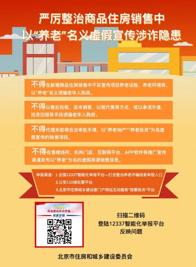 據(jù)“安居北京”公眾號消息,北京住建委發(fā)布提示,不得在新建商品住房銷售中不實宣傳項目養(yǎng)老設(shè)施、養(yǎng)老環(huán)境等,以“養(yǎng)老”名義誘騙老年人購房。不得以售后包租、返本銷售、以租代售等方式,或以承諾升值、投資回報等手段誘騙老年人購房。