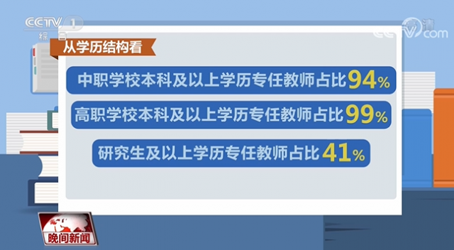 據(jù)介紹,全國(guó)職業(yè)學(xué)校專任教師規(guī)模從2012年的111萬(wàn)人增加到2021年的129萬(wàn)人,增幅為17%。從學(xué)歷結(jié)構(gòu)看,中職學(xué)校本科及以上學(xué)歷專任教師占比94%,高職學(xué)校本科及以上學(xué)歷專任教師占比99%,研究生及以上學(xué)歷專任教師占比41%。