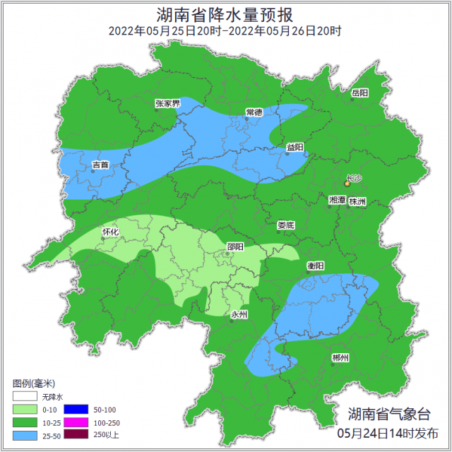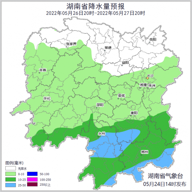 24日20時(shí)至25日20時(shí),岳陽陰天間多云,其他地區(qū)陰天有小雨,其中永州南部、郴州南部、株洲南部局地中到大雨;南風(fēng)2~3級(jí);最高氣溫湘南25~27℃,其他地區(qū)27~29℃;最低氣溫19~21℃。