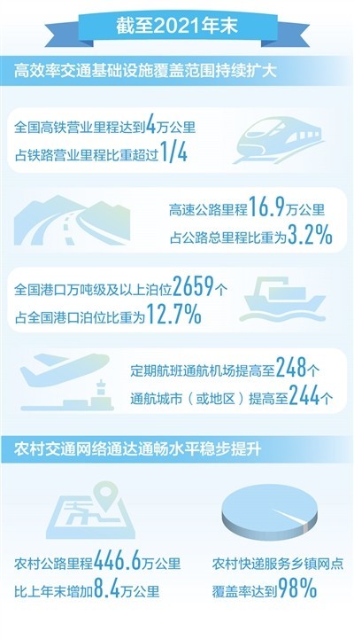 高效率交通基礎(chǔ)設(shè)施覆蓋范圍持續(xù)擴(kuò)大。截至2021年末,全國高鐵營業(yè)里程達(dá)到4萬公里,占鐵路營業(yè)里程比重超過1/4。高速公路里程16.9萬公里,比上年末增加8090公里,占公路總里程比重為3.2%,呈現(xiàn)穩(wěn)步提高態(tài)勢(shì)。全國港口萬噸級(jí)及以上泊位2659個(gè)、增加67個(gè),占全國港口泊位比重為12.7%、提高1個(gè)百分點(diǎn)。定期航班通航機(jī)場(chǎng)、通航城市(或地區(qū))分別提高至248個(gè)和244個(gè)。