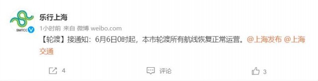 據上海市交通委員會交通指揮中心官方微博@樂行上海 消息,接通知:6月6日0時起,本市輪渡所有航線恢復正常運營。