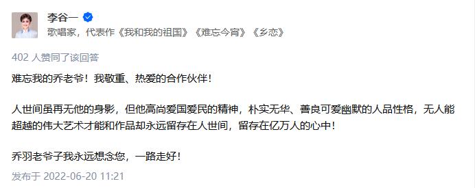 李谷一在聽聞喬羽逝世的消息后,第一時(shí)間發(fā)文悼念:“難忘我的喬老爺!我敬重、熱愛的合作伙伴!人世間雖再無他的身影,但他高尚愛國愛民的精神,樸實(shí)無華、善良可愛幽默的人品性格,無人能超越的偉大藝術(shù)才能和作品卻永遠(yuǎn)留存在人世間,留存在億萬人的心中!喬羽老爺子我永遠(yuǎn)想念您,一路走好!”