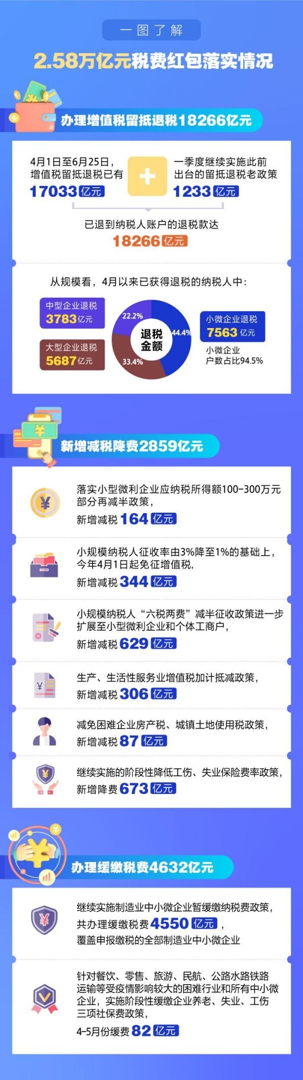 國家稅務(wù)總局?jǐn)?shù)據(jù)顯示,截至6月25日,新的組合式稅費(fèi)支持政策累計(jì)新增退稅減稅降費(fèi)及緩稅緩費(fèi)約2.58萬億元。預(yù)計(jì)上半年新的組合式稅費(fèi)支持政策將新增退稅減稅降費(fèi)及緩稅緩費(fèi)約2.86萬億元。