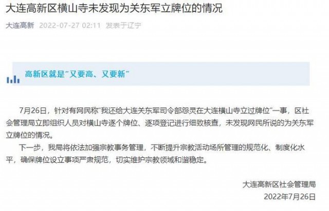 據(jù)大連高新微信公眾號(hào)消息, 7月26日,針對(duì)有網(wǎng)民稱“我還給大連關(guān)東軍司令部怨靈在大連橫山寺立過(guò)牌位”一事,區(qū)社會(huì)管理局立即組織人員對(duì)橫山寺逐個(gè)牌位、逐項(xiàng)登記進(jìn)行細(xì)致核查,未發(fā)現(xiàn)網(wǎng)民所說(shuō)的為關(guān)東軍立牌位的情況。