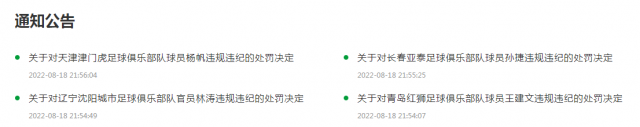 18日晚,中國(guó)足協(xié)網(wǎng)站發(fā)布4則球員、俱樂(lè)部官員違規(guī)違紀(jì)的處罰決定,中超天津津門虎球員楊帆、中超長(zhǎng)春亞泰球員孫捷及中乙青島紅獅球員王建文均停賽5場(chǎng),中甲遼寧沈陽(yáng)城市足球俱樂(lè)部官員林濤6場(chǎng)比賽禁止進(jìn)入體育場(chǎng)。處罰決定全文如下: