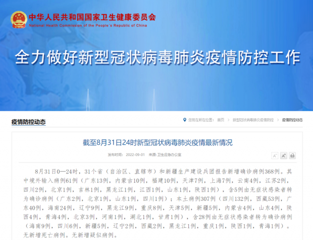 8月31日0—24時,31個省(自治區(qū)、直轄市)和新疆生產(chǎn)建設兵團報告新增確診病例368例。其中境外輸入病例61例(廣東13例,內(nèi)蒙古10例,福建10例,天津7例,上海7例,云南4例,江蘇2例,四川2例,北京1例,吉林1例,黑龍江1例,江西1例,山東1例,陜西1例),含5例由無癥狀感染者轉(zhuǎn)為確診病例(廣東2例,北京1例,山東1例,四川1例);本土病例307例(四川132例,西藏53例,廣東40例,海南24例,遼寧9例,黑龍江9例,重慶8例,天津5例,新疆5例,內(nèi)蒙古4例,山東4例,陜西4例,青海4例,北京3例,河南1例,湖北1例,甘肅1例),含28例由無癥狀感染者轉(zhuǎn)為確診病例(海南9例,四川6例,新疆5例,遼寧2例,西藏2例,黑龍江1例,重慶1例,陜西1例,青海1例)。無新增死亡病例。無新增疑似病例。
