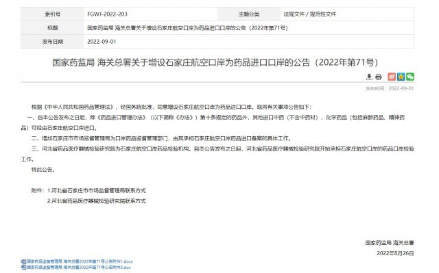 根據(jù)《中華人民共和國藥品管理法》,經(jīng)國務(wù)院批準(zhǔn),同意增設(shè)石家莊航空口岸為藥品進(jìn)口口岸?,F(xiàn)將有關(guān)事項(xiàng)公告如下: