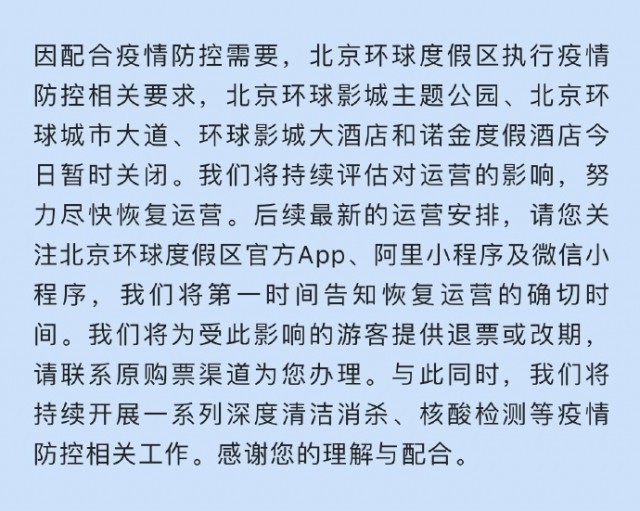 據(jù)@北京環(huán)球度假區(qū) 微博消息,因配合疫情防控需要,北京環(huán)球度假區(qū)執(zhí)行疫情防控相關要求,北京環(huán)球影城主題公園、北京環(huán)球城市大道、環(huán)球影城大酒店和諾金度假酒店今日暫時關閉。我們將持續(xù)評估對運營的影響,努力盡快恢復運營。后續(xù)最新的運營安排,請您關注北京環(huán)球度假區(qū)官方App、阿里小程序及微信小程序,我們將第一時間告知恢復運營的確切時間。我們將為受此影響的游客提供退票或改期,請聯(lián)系原購票渠道為您辦理。與此同時,我們將持續(xù)開展一系列深度清潔消殺、核酸檢測等疫情防控相關工作。感謝您的理解與配合。