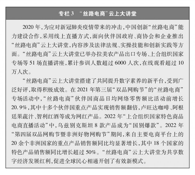 “絲路電商”合作成果豐碩。自2016年以來,中國與五大洲23個國家建立雙邊電子商務(wù)合作機制,建立中國-中東歐國家、中國-中亞五國電子商務(wù)合作對話機制,通過政企對話、聯(lián)合研究、能力建設(shè)等推動多層次交流合作,營造良好發(fā)展環(huán)境,構(gòu)建數(shù)字合作格局。電子商務(wù)企業(yè)加速“出海”,帶動跨境物流、移動支付等各領(lǐng)域?qū)崿F(xiàn)全球發(fā)展。積極參與世界貿(mào)易組織、二十國集團、亞太經(jīng)合組織、金磚國家、上合組織等多邊和區(qū)域貿(mào)易機制下的電子商務(wù)議題討論,與自貿(mào)伙伴共同構(gòu)建高水平數(shù)字經(jīng)濟規(guī)則。電子商務(wù)國際規(guī)則構(gòu)建取得突破,區(qū)域全面經(jīng)濟伙伴關(guān)系協(xié)定電子商務(wù)章節(jié)成為目前覆蓋區(qū)域最廣、內(nèi)容全面、水平較高的電子商務(wù)國際規(guī)則。