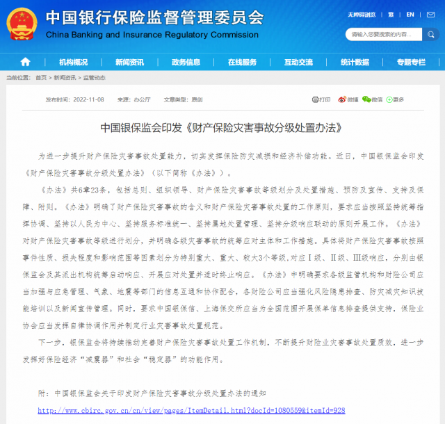 銀保監(jiān)會網站11月8日消息,為進一步提升財產保險災害事故處置能力,切實發(fā)揮保險防災減損和經濟補償功能。近日,中國銀保監(jiān)會印發(fā)《財產保險災害事故分級處置辦法》(以下簡稱《辦法》)。