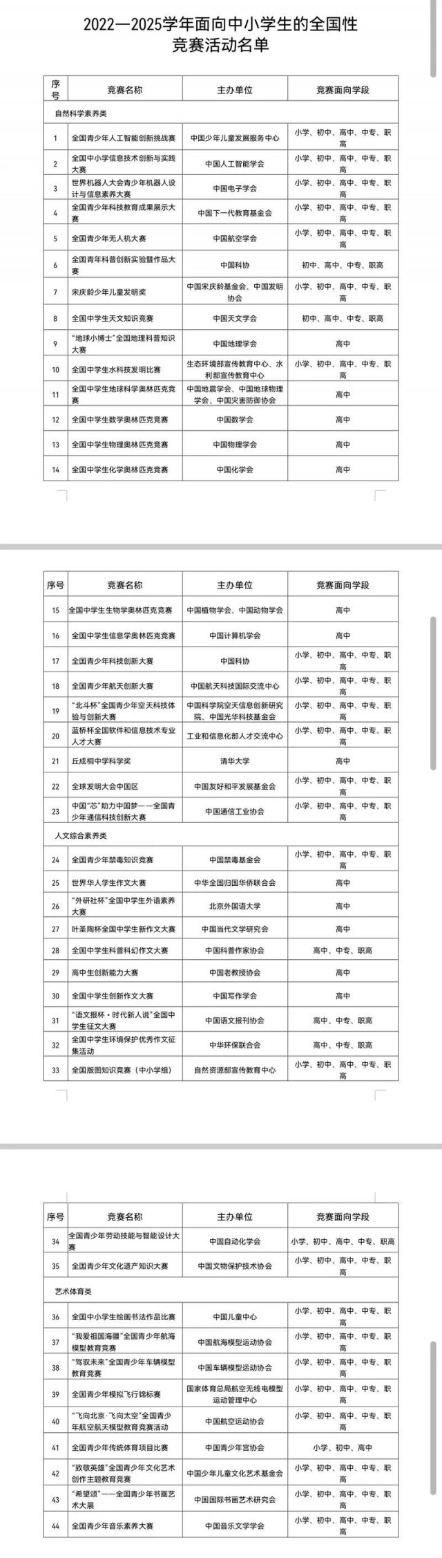 教育部公布44項(xiàng)中小學(xué)生全國性競賽活動名單
