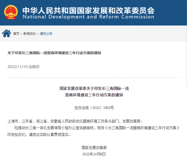 國家發(fā)展改革委近日發(fā)布《長三角國際一流營商環(huán)境建設(shè)三年行動方案》(以下簡稱《方案》),提出到2025年,長三角區(qū)域資源要素有序自由流動,行政壁壘逐步消除,統(tǒng)一開放的市場體系基本建立。區(qū)域發(fā)展整體水平和效率進(jìn)一步提升,市場化、法治化、國際化的一流營商環(huán)境率先建成,營商環(huán)境國際競爭力躍居世界前列。