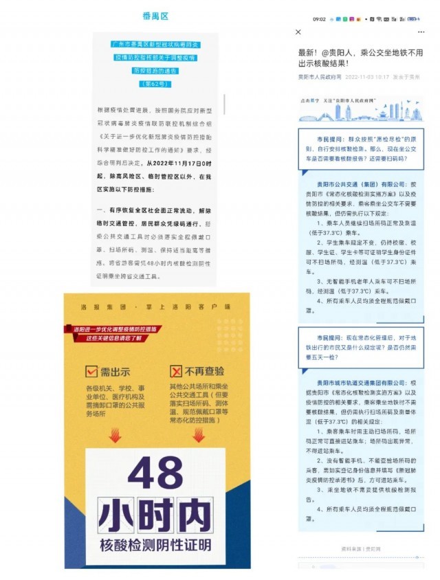 最早宣布取消的是貴陽市。11月3日,“貴陽市人民政府網(wǎng)”發(fā)布《最新!@貴陽人,乘公交坐地鐵不用出示核酸結果!》,宣布根據(jù)貴陽市《常態(tài)化核酸檢測實施方案》以及疫情防控的相關要求,乘客乘坐公交車和地鐵時均不需要查驗核酸檢測結果。