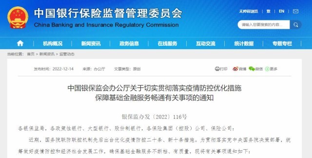 央視網(wǎng)消息:12月13日,中國銀保監(jiān)會辦公廳發(fā)文《關(guān)于切實貫徹落實疫情防控優(yōu)化措施 保障基礎(chǔ)金融服務(wù)暢通有關(guān)事項的通知》。