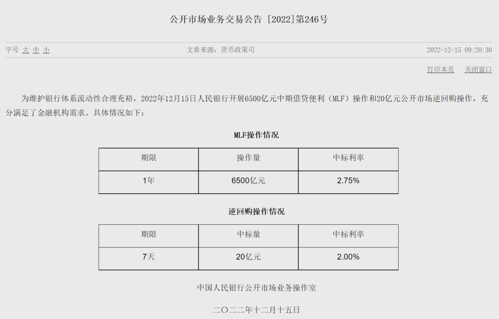 為維護銀行體系流動性合理充裕,12月15日中國人民銀行開展6500億元中期借貸便利(MLF)操作和20億元公開市場逆回購操作,充分滿足了金融機構需求,中標利率均與前次持平。