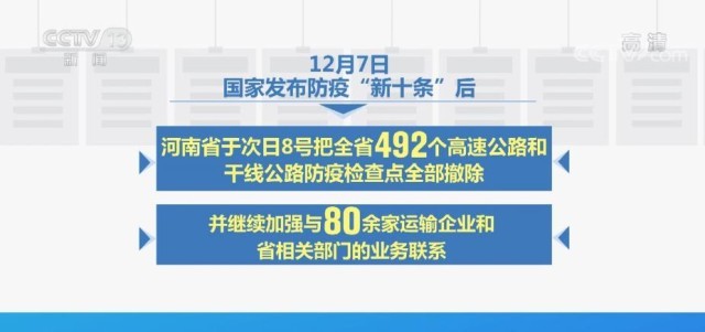 據了解,12月7日,國家發(fā)布防疫“新十條”后,河南省于次日把全省492個高速公路和干線公路防疫檢查點全部撤除,并繼續(xù)加強與80余家運輸企業(yè)和省相關部門的業(yè)務聯(lián)系,充分發(fā)揮“12328服務監(jiān)督熱線+三級調度”機制作用,每日收集運輸受阻問題,以便及時解決問題。