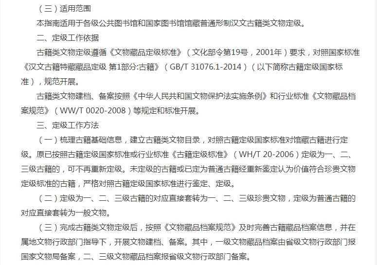 定級(jí)為一、二、三級(jí)古籍的對(duì)應(yīng)直接套轉(zhuǎn)為一、二、三級(jí)珍貴文物,定級(jí)為普通古籍的對(duì)應(yīng)直接套轉(zhuǎn)為一般文物。
