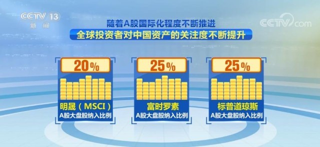 隨著A股國際化程度不斷推進(jìn),全球投資者對中國資產(chǎn)的關(guān)注度不斷提升。明晟(MSCI)、富時(shí)羅素和標(biāo)普道瓊斯的A股大盤股納入比例已分別達(dá)到20%、25%和25%。
