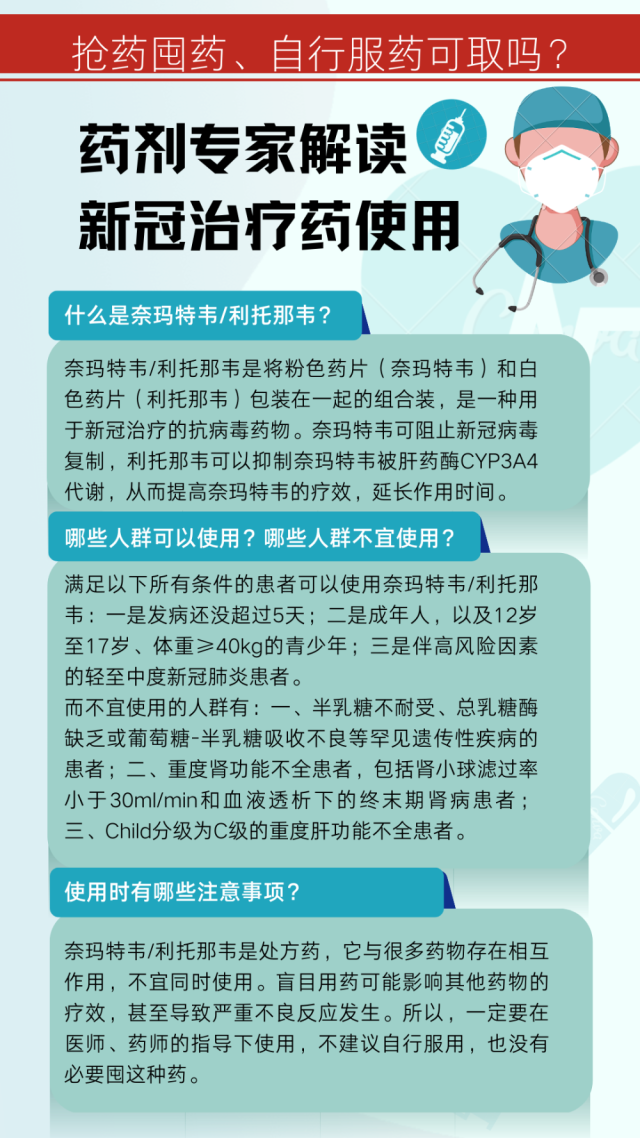 最近,新冠治療藥奈瑪特韋/利托那韋(Paxlovid)備受關(guān)注。它是什么藥?哪些人可以使用?如何使用?有哪些注意事項呢?陸軍軍醫(yī)大學陸軍特色醫(yī)學中心藥劑科臨床藥師作出了解答。