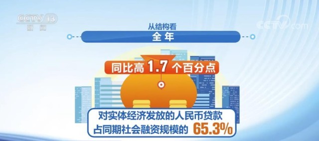 從結構看,全年對實體經濟發(fā)放的人民幣貸款占同期社會融資規(guī)模的65.3%,同比高1.7個百分點。