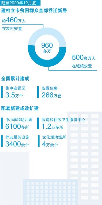 習近平總書記強調:“易地搬遷是解決一方水土養(yǎng)不好一方人、實現(xiàn)貧困群眾跨越式發(fā)展的根本途徑,也是打贏脫貧攻堅戰(zhàn)的重要途徑。”黨的十八大以來,全國累計建成集中安置區(qū)3.5萬個、安置住房266萬套。到2020年底,全國易地扶貧搬遷規(guī)劃建設任務全面完成,近千萬生活在“一方水土難養(yǎng)一方人”地方的建檔立卡貧困人口實現(xiàn)易地扶貧搬遷,搬入新家園、開啟新生活。