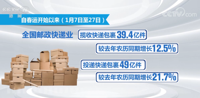 數(shù)據(jù)顯示,自春運開始以來(1月7日至27日),全國郵政快遞業(yè)攬收快遞包裹39.4億件,較去年農(nóng)歷同期增長12.5%;投遞快遞包裹49億件,較去年農(nóng)歷同期增長21.7%。