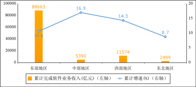 東部地區(qū)保持較快增長,中、西部地區(qū)增勢(shì)突出。2022年,東部、中部、西部和東北地區(qū)分別完成軟件業(yè)務(wù)收入88663億元、5390億元、11574億元和2499億元,分別同比增長10.6%、16.9%、14.3%和8.7%。其中,中部、西部地區(qū)高出全國平均水平5.7、3.1個(gè)百分點(diǎn)。四個(gè)地區(qū)軟件業(yè)務(wù)收入在全國總收入中的占比分別為82.0%、5.0%、10.7%和2.3%。