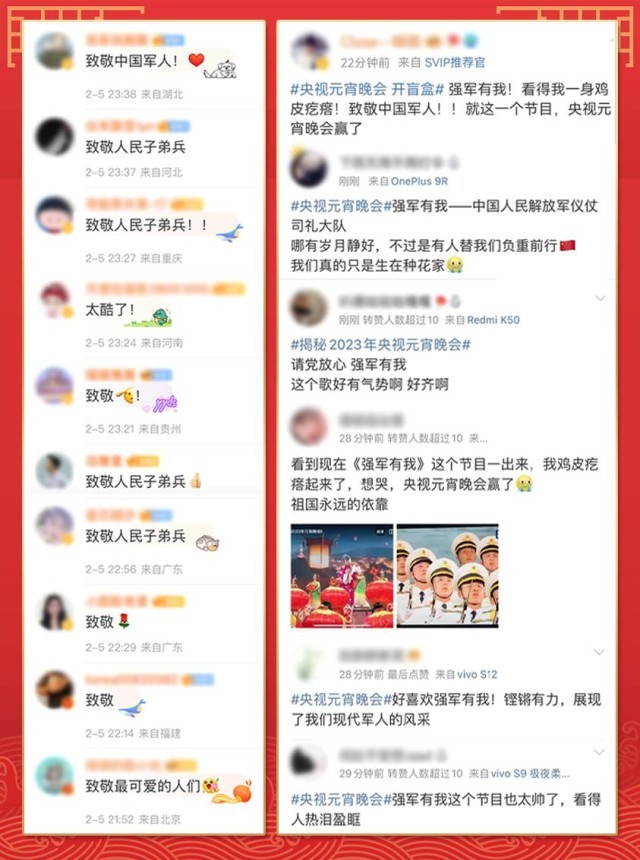 “請黨放心,強軍有我”“清澈的愛,獻給我的祖國”……聲聲誓言、字字鏗鏘。首次參加總臺元宵晚會的中國人民解放軍儀仗司禮大隊奏唱的歌曲《強軍有我》,不僅唱出中國軍人的拳拳赤子心,更唱出了“最可愛的人”那豪邁激情和磅礴氣勢。整齊劃一的動作、堅定有力的眼神讓無數(shù)網(wǎng)友直呼:“震撼!這就是中國排面”“為人民子弟兵熱淚盈眶”“致敬中國軍人!感謝你們?yōu)榇蠹邑撝厍靶小?。而網(wǎng)友們也用整齊一致的留言共同致敬“最可愛的人”。