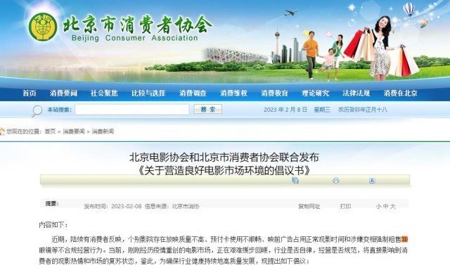 北京消費(fèi)者協(xié)會倡議:維護(hù)電影市場秩序 加強(qiáng)對放映質(zhì)量管理