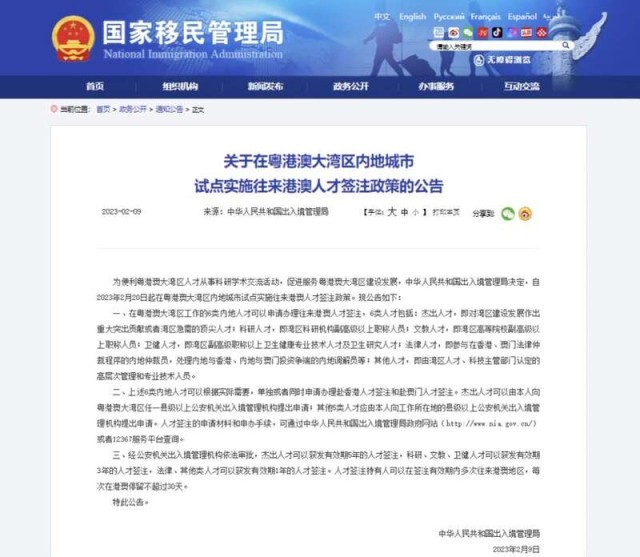 中國青年報客戶端北京2月9日電(中青報·中青網記者 何春中)中華人民共和國出入境管理局2月9日發(fā)布公告,為便利粵港澳大灣區(qū)人才從事科研學術交流活動,促進服務粵港澳大灣區(qū)建設發(fā)展,自2023年2月20日起在粵港澳大灣區(qū)內地城市試點實施往來港澳人才簽注政策。