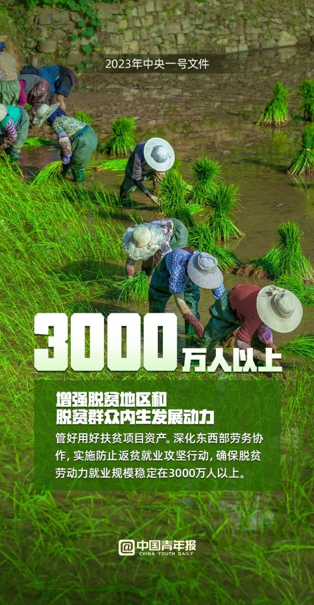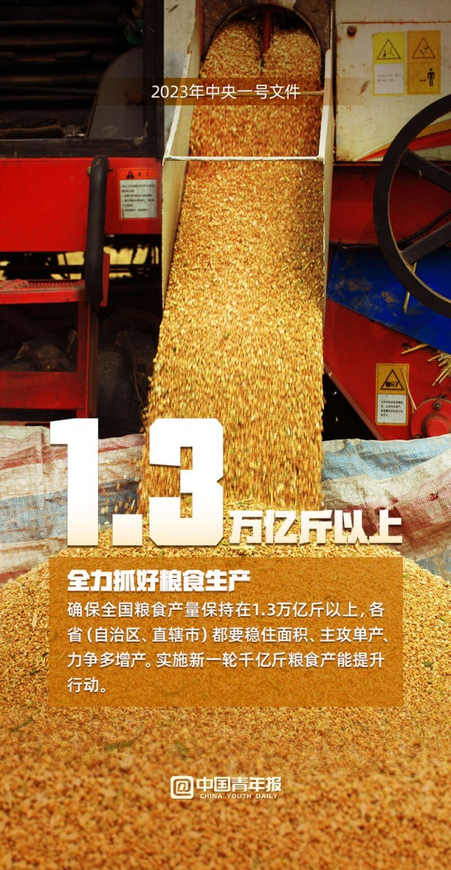 中國青年報客戶端訊(中青報·中青網(wǎng)見習(xí)記者 魏婉 制圖 程璨)“確保全國糧食產(chǎn)量保持在1.3萬億斤以上、確保脫貧勞動力就業(yè)規(guī)模穩(wěn)定在3000萬人以上……”2月13日,2023年中央一號文件正式發(fā)布,這份文件題為《中共中央 國務(wù)院關(guān)于做好2023年全面推進鄉(xiāng)村振興重點工作的意見》,全文共九個部分。文件提出,堅決守牢確保糧食安全、防止規(guī)模性返貧等底線,扎實推進鄉(xiāng)村發(fā)展、鄉(xiāng)村建設(shè)、鄉(xiāng)村治理等重點工作,加快建設(shè)農(nóng)業(yè)強國,建設(shè)宜居宜業(yè)和美鄉(xiāng)村。
