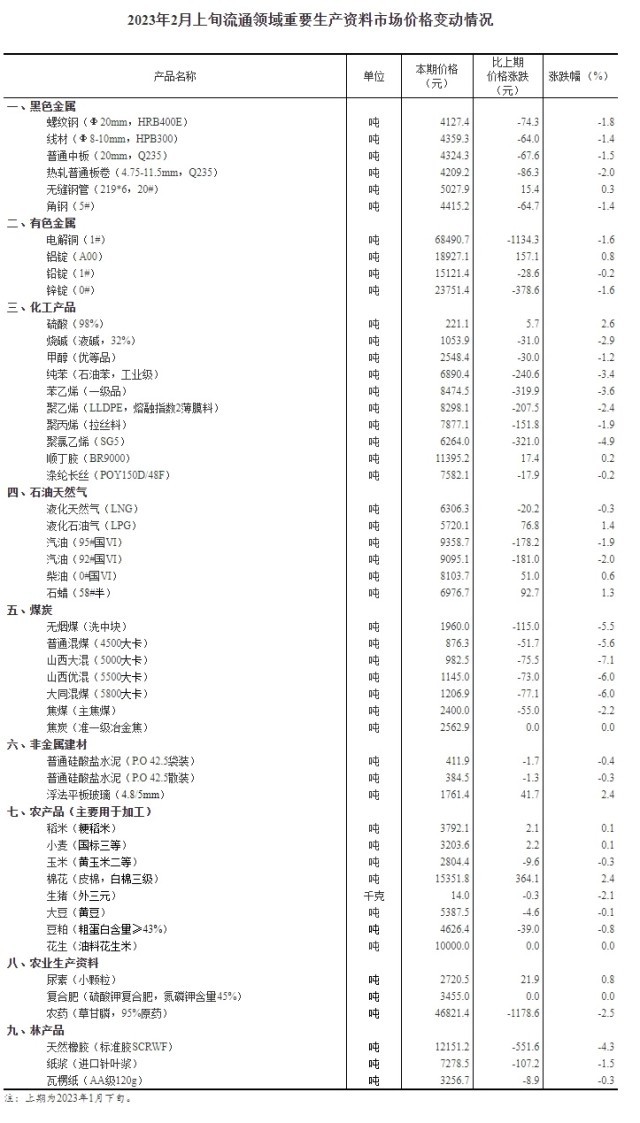 中新網(wǎng)2月14日電 據(jù)國家統(tǒng)計(jì)局網(wǎng)站14日消息,據(jù)對全國流通領(lǐng)域9大類50種重要生產(chǎn)資料市場價(jià)格的監(jiān)測顯示,2023年2月上旬與1月下旬相比,12種產(chǎn)品價(jià)格上漲,35種下降,3種持平。其中,生豬(外三元)價(jià)格為14元/千克,較1月下旬相比下降2.1%。(中新財(cái)經(jīng))