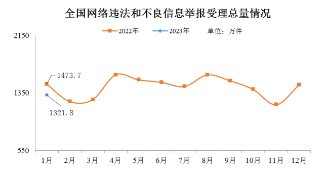 2023年1月全國受理網(wǎng)絡(luò)違法和不良信息舉報(bào)1321.8萬件