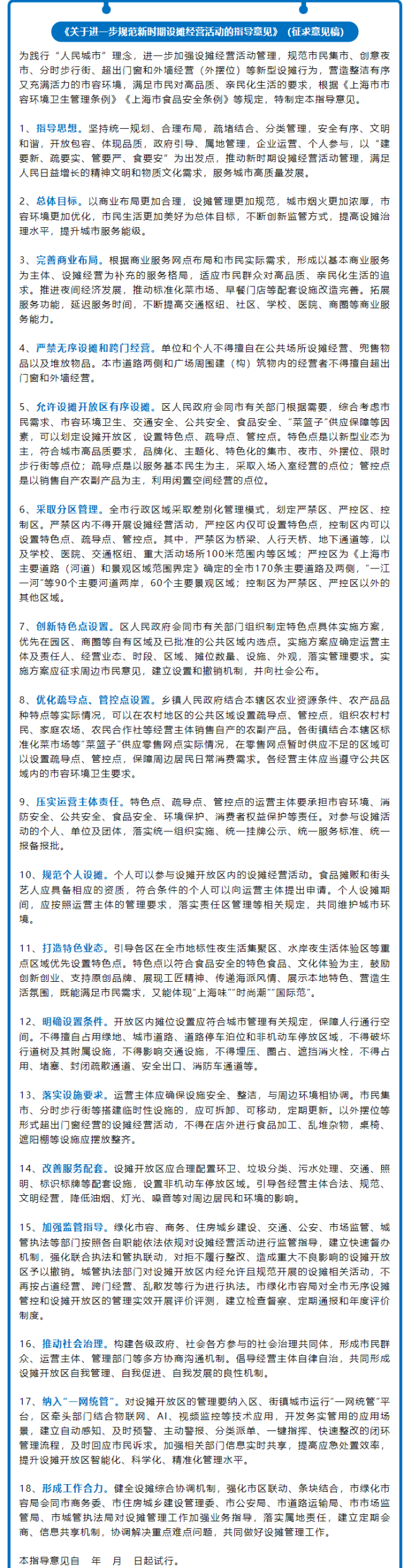 央視網(wǎng)消息:據(jù)“綠色上海”公眾號2月20日消息,根據(jù)《上海市市容環(huán)境衛(wèi)生管理?xiàng)l例》,為進(jìn)一步加強(qiáng)設(shè)攤經(jīng)營活動(dòng)管理,規(guī)范市民集市、創(chuàng)意夜市、分時(shí)步行街、超出門窗和外墻經(jīng)營(簡稱外擺位)等新型設(shè)攤行為,結(jié)合上海市實(shí)際,上海市綠化和市容管理局經(jīng)會同市相關(guān)部門研究,擬定了《關(guān)于進(jìn)一步規(guī)范新時(shí)期設(shè)攤經(jīng)營活動(dòng)的指導(dǎo)意見》(征求意見稿),現(xiàn)面向社會公開征求意見。市民和各單位可以將書面意見直接寄送至上海市膠州路768號308室,郵編:200040;也可以發(fā)送電子郵件至shsrglc@126.com。征求意見截止日期:2023年3月22日。
