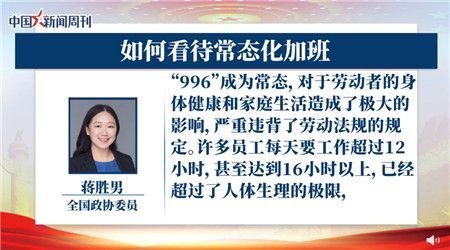 全國政協(xié)委員、編劇蔣勝男建議加強(qiáng)勞動(dòng)法對(duì)勞動(dòng)者的休息權(quán)保護(hù),對(duì)企事業(yè)單位八小時(shí)工作制的執(zhí)行情況加強(qiáng)監(jiān)督管理。
