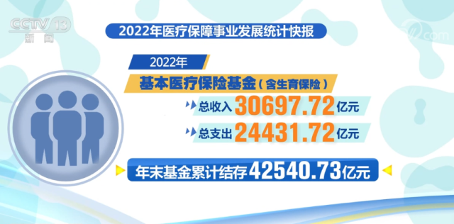 2022年,基本醫(yī)療保險(xiǎn)基金(含生育保險(xiǎn))總收入、總支出分別為30697.72億元、24431.72億元,年末基金累計(jì)結(jié)存42540.73億元。