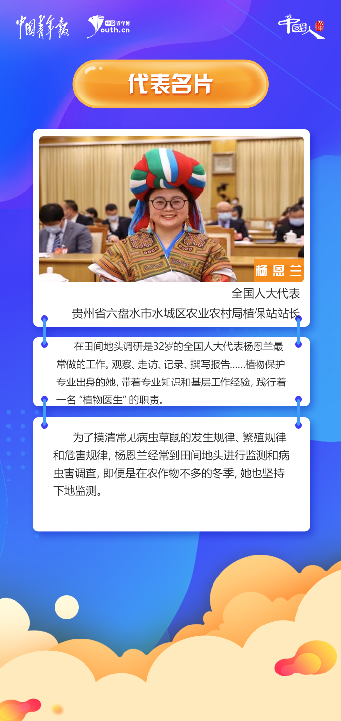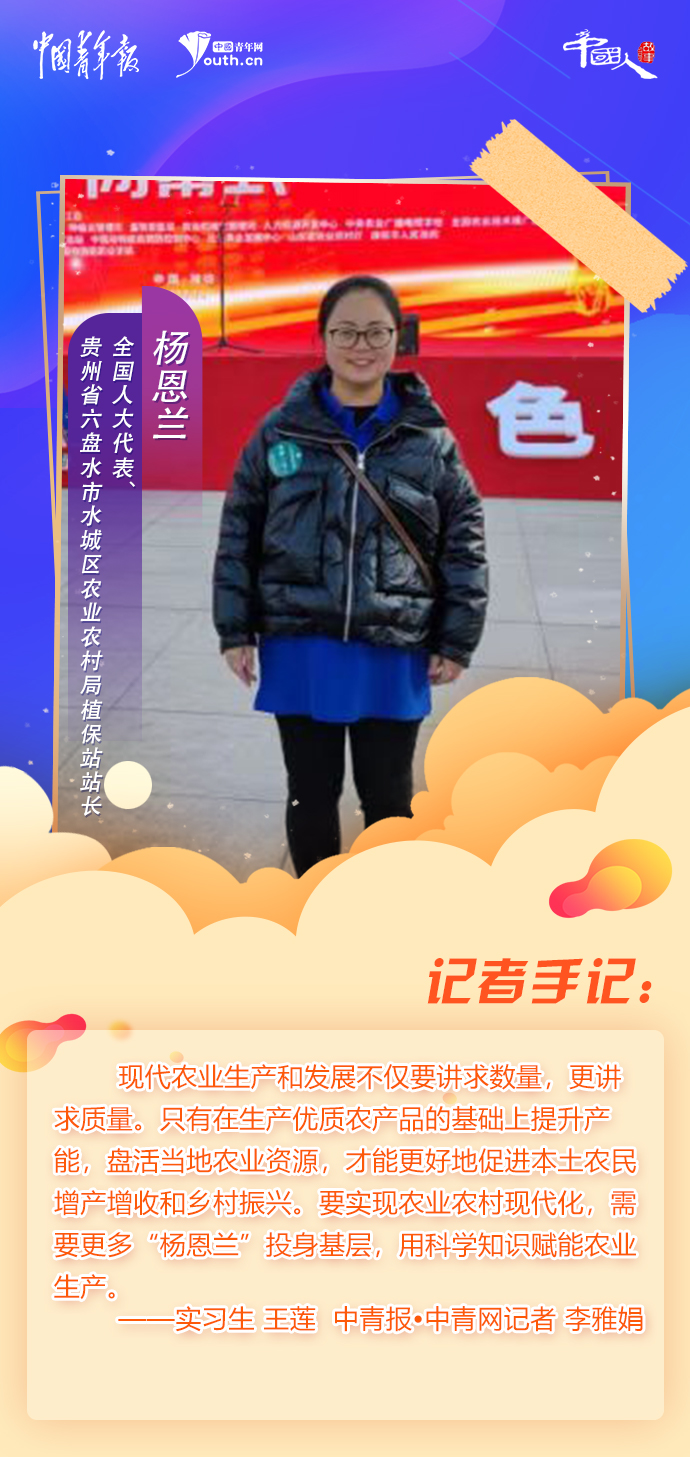 在田間地頭調(diào)研是32歲的全國人大代表楊恩蘭最常做的工作。觀察、走訪、記錄、撰寫報告……植物保護專業(yè)出身的她,帶著專業(yè)知識和基層工作經(jīng)驗,踐行著一名“植物醫(yī)生”的職責(zé)。