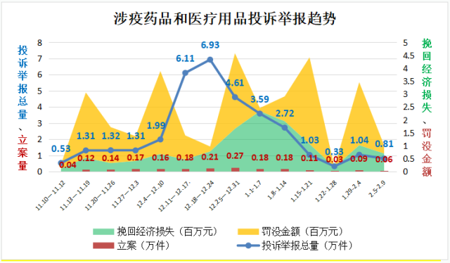 “二十條”和“新十條”出臺后,疫情防控重心從防控感染轉(zhuǎn)到醫(yī)療救治,2022年11月10日至2022年底,全國12315平臺接收相關(guān)投訴舉報24.11萬件,同比增長3.88倍,環(huán)比增長2.95倍,最高峰值達(dá)到19.5倍。其中,投訴14.18萬件,舉報9.93萬件,挽回經(jīng)濟損失498.17萬元。